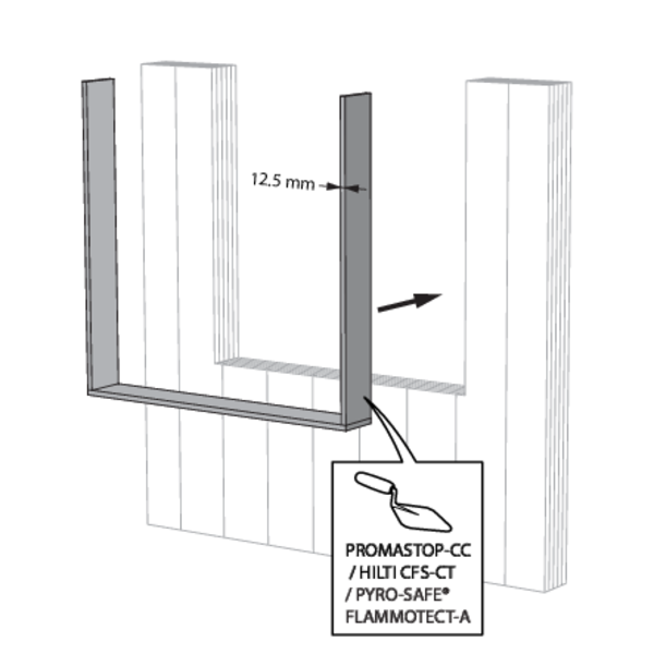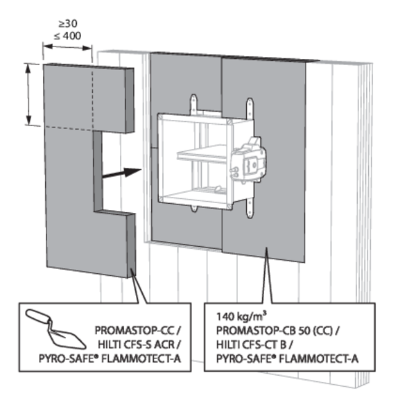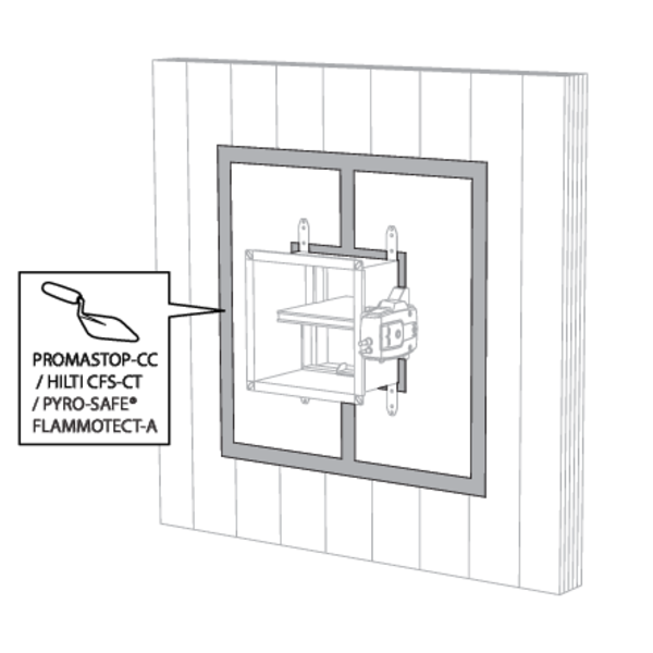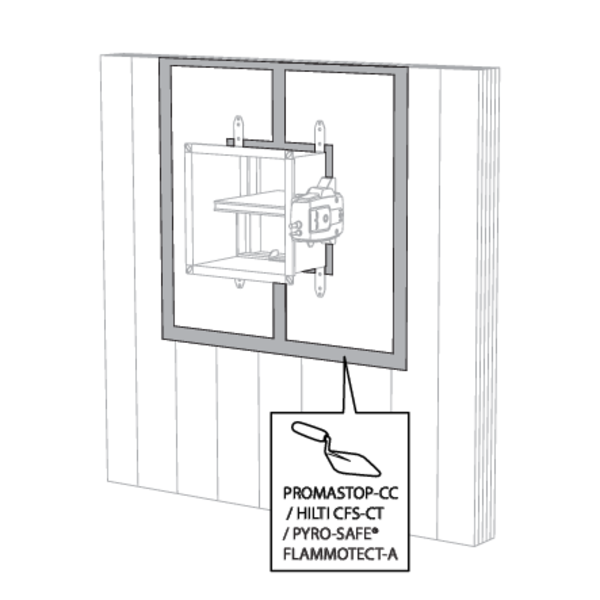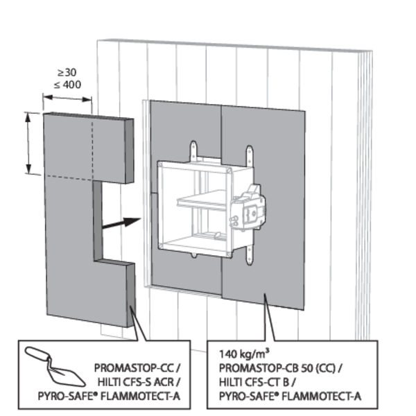 Die Öffnung um die Brandschutzklappe wird mit 2 Lagen aus 50 mm dicken Steinwolleplatten mit feuerbeständiger Beschichtung auf einer Seite (PROMASTOP-CB 50 / PROMASTOP-CB/CC 50 / HILTI CFS-CT B / Mulcol Multimastic FB1 / PYRO-SAFE® FLAMMOTECT-A) abgedichtet.