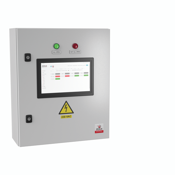 Der kapazitive 12-Zoll-Touchscreen ist in die Schranktür integriert. Ein industrietauglicher lüfterloser Box-PC führt die ringview-Software auf dem Bildschirm aus. Die Software bietet eine Echtzeitanzeige des aktuellen Systemstatus, einschließlich Alarme, Elementgruppen usw. in verschiedenen Anzeigemodi. Es können verschiedene Arten von Berichten erstellt werden.