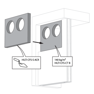 The opening in the wall around the insulated duct, is sealed with 2 rigid stone wool boards of 50 mm with fire-resistant coating on one side (type Promastop CB50 / Hilti CFS-CT W).
