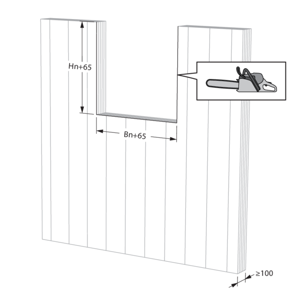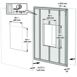Build the shaftwall acc. to British Gypsum construction details. Create the opening in the wall between the studs or by bridging studs. Mind tolerances in the thickness of the British Gypsum Fireline boards when dimensioning the wall opening. Finished wall opening incl. lining to measure (Wn+65) x (Hn+65).