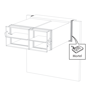 - Aerated concrete ≥ 100 mm | EI 90 (ve i o) S - (300 Pa) | Gegalvaniseerd kanaal + gecoate steenwol ≥ 140 kg/m³ 2x50 mm + Inbouwkit IFW | Type of installation: remote from the wall, 0/180°. Minimal distances authorised. | 200x100 mm ≤ CU-LT ≤ 800x600 mm