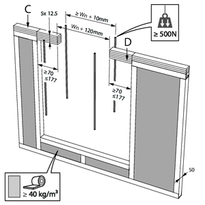 The suspensions consist of threaded rods “C” and U-shaped steel profiles “D”. A free space of maximum 25 mm is left between the threaded rods and the vertical walls of the stone wool casing “B”.