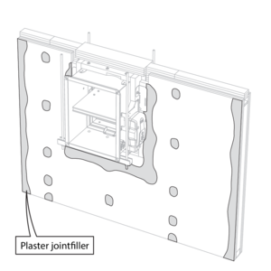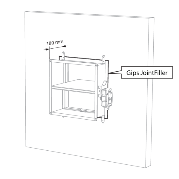 The opening around the damper is sealed with 2 rigid stone wool boards of 50 mm. These boards should be placed in a slanted position and the joints should be covered all around with filling paste.
