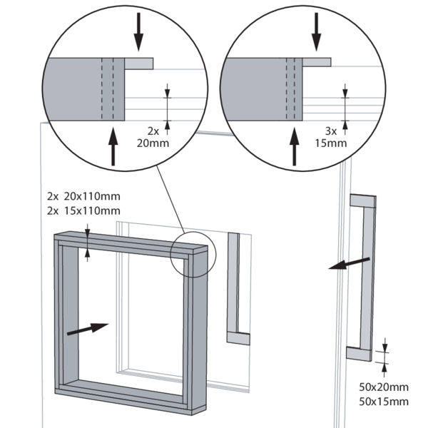 - Cross-laminated timber ≥ 100 mm | EI 90 (ve i o) S - (300 Pa) | Inbouwblok IFW | Type of installation: built-in 0/90/180/270°. Minimal distances authorised. | 200x100 mm ≤ CU-LT ≤ 800x600 mm