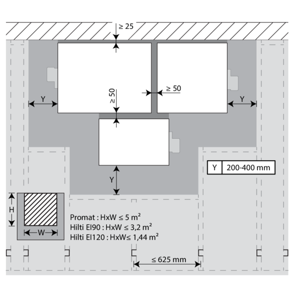 The dampers can be installed at a minimum distance from an adjacent floor/ceiling (≥ 25 mm), from an adjacent wall or from another damper (≥ 50 mm).