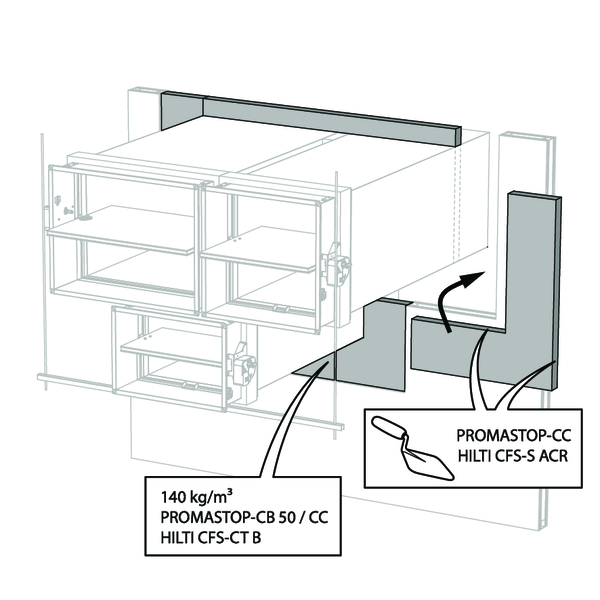 For EI 120 S, the casing of the fire damper must be covered with a layer (> 1 mm) of coating (type PROMASTOP-CC / HILTI CFS-CT) both sides of the wall/partition.