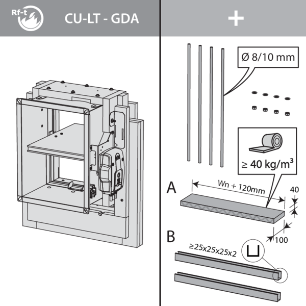 For the Rf-t fire dampers, the solution consists of the following elements: A: Universal sealing for minimal distance; B: Sealing compliant with existing classifications (Declaration of Performance).