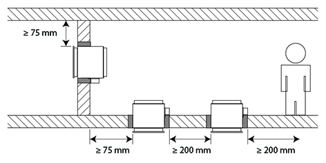 Si la paroi est traversée par différentes conduites (câbles, PVC, HVAC, ...), la distance entre le colmatage du clapet coupe-feu et les autres techniques doit être d'au moins 200 mm, sauf si testé autrement (une norme spécifique est en cours d'élaboration).