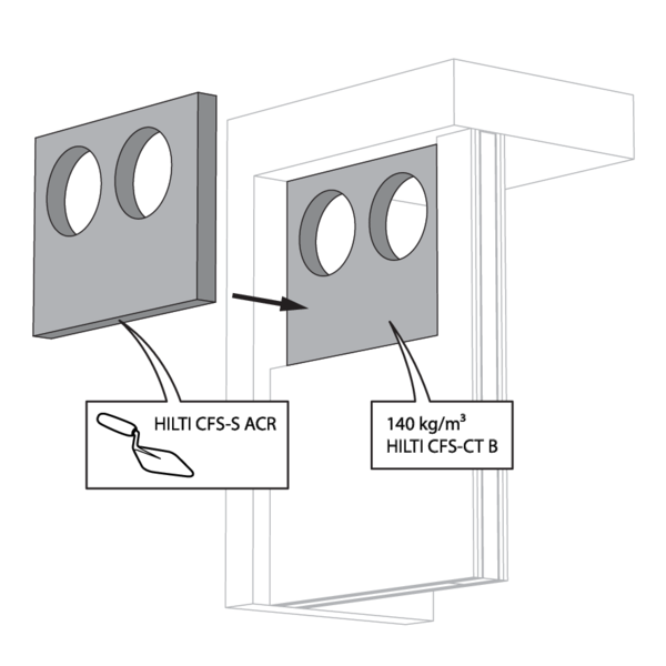 La réservation dans la paroi autour de la gaine isolée est scellée avec 2 panneaux de laine de roche rigides de 50 mm avec couche d'enduit coupe-feu sur une face (type Promastop CB50 / Hilti CFS-CT B).