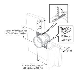 - Béton cellulaire ≥ 150 mm | EI 90 (ho i o) S - (300 Pa) | Panneaux de laine de roche + enduit ≥ 140 kg/m³ | Type de pose : encastré, 0-360°. Distances minimales autorisées. | Ø 100-315 mm