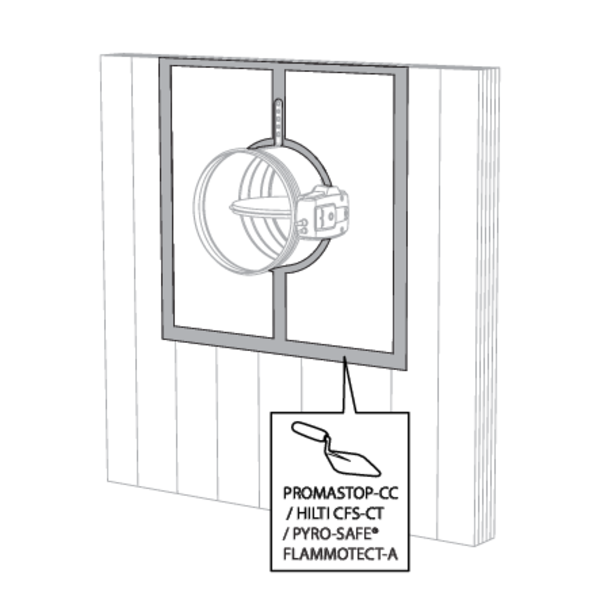 La réservation autour de la gaine dans la paroi est remplie par une épaisseur de panneaux de laine de roche de type Promastop CB(/CC) / Hilti CFS-CT B « G » revêtus sur les chants d’enduit PROMASTOP-CC / HILTI CFS-S ACR permettant leur fixation.
