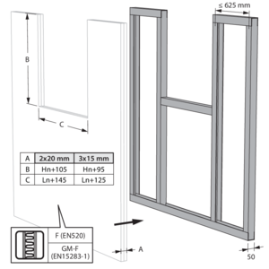 - Ossature métallique et plaques de plâtre Type F (EN 520) ≥ 90 mm | EI 90 (ve i o) S - (300 Pa) | Inbouwblok IFW | Type de pose : encastré 0/90/180/270°. Distances minimales autorisées. | 200x100 mm ≤ CU-LT ≤ 800x600 mm