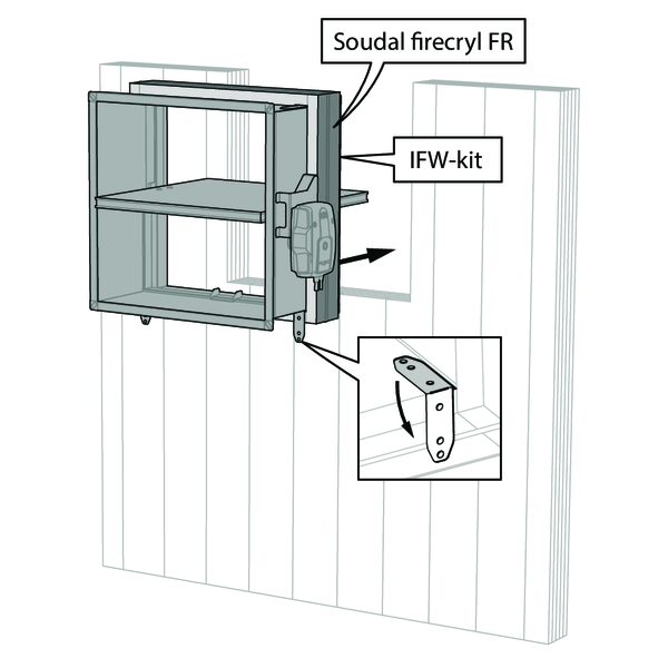 Le clapet est pourvu du kit IFW et monté déporté sur une gaine traversante en tôle d’acier galvanisé. Un supportage est mis en oeuvre au pas de 1500 mm ainsi qu’un supportage complémentaire au niveau de la jonction entre la gaine et le clapet.