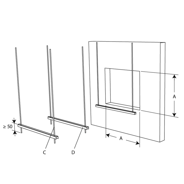 Une réservation de dimensions maximales « A » est réalisée au travers de la paroi. Pour une cloison légère, prévoir l’assemblage de la paroi selon «Montage en paroi flexible et massive - calfeutrement panneaux de laine de roche coupe-feu» ci-avant.