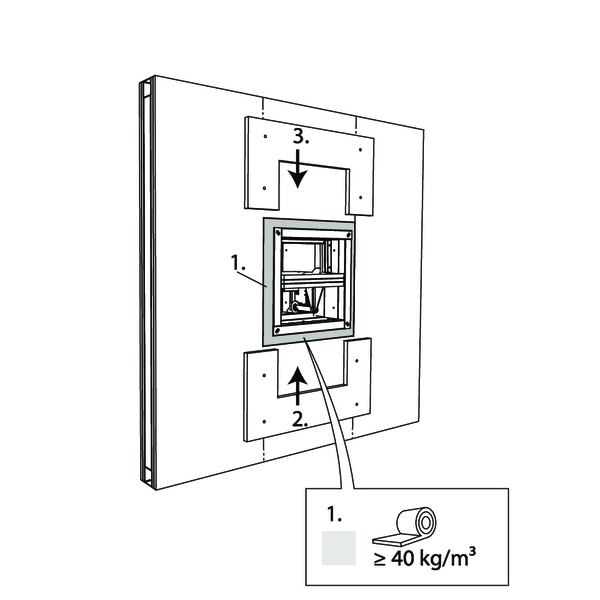 A. Colmatage de la réservation du côté des distances minimales par rapport à une paroi/dalle adjacente ou un autre clapet coupe-feu : des panneaux rigides de laine de roche (150 kg/m³) sont appliqués sur une profondeur de min. 400 mm, dont 150 mm sur le côté mécanique de la paroi. Les panneaux de laine de roche doivent au moins affleurer le mur.
