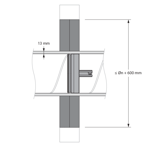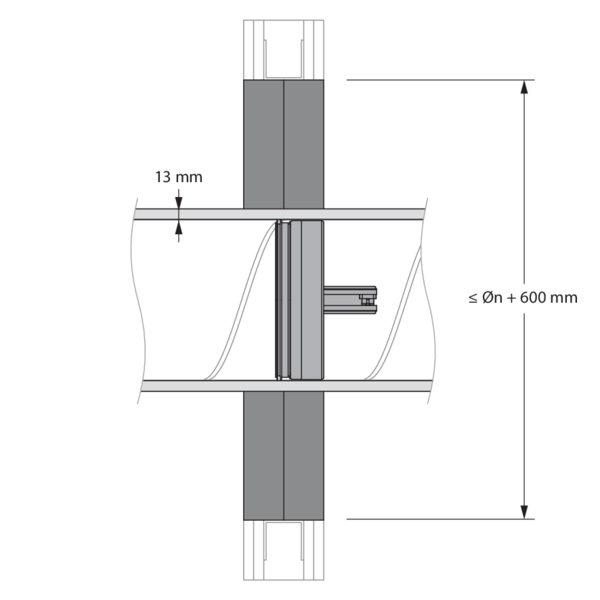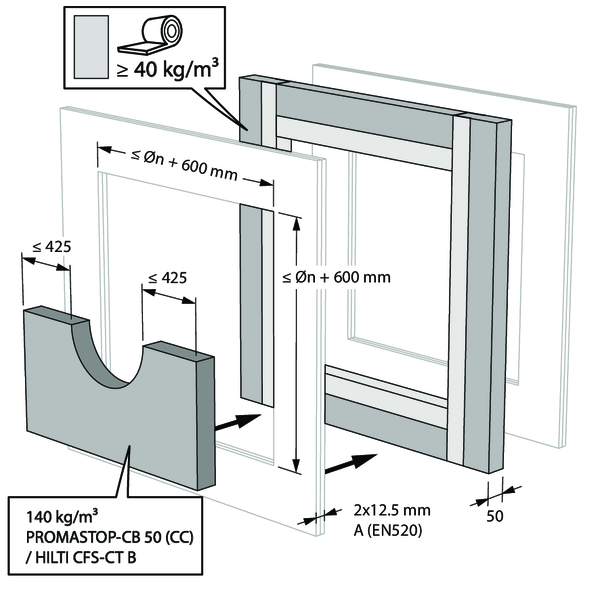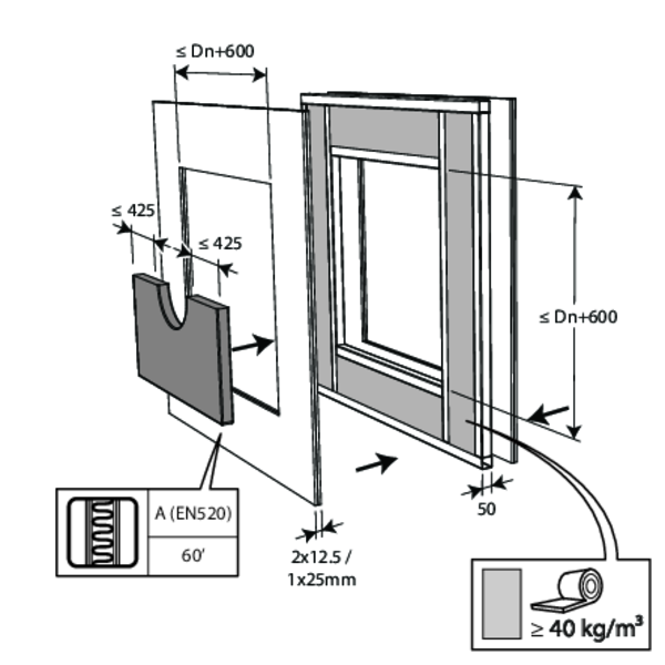 - Ossature métallique et plaques de plâtre Type A (EN 520) ≥ 100 mm | EI 60 (ve i o) S - (300Pa) | Conduit isolé (ArmaFlex EVO, ArmaFlex Protect – jusqu'à 13 mm) + panneaux de laine de roche + enduit ≥ 140 kg/m³ | Type de pose : encastré en conduit traversant, 0-360° | SC+60 Ø 100-200 mm