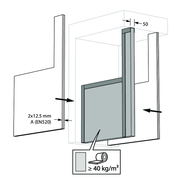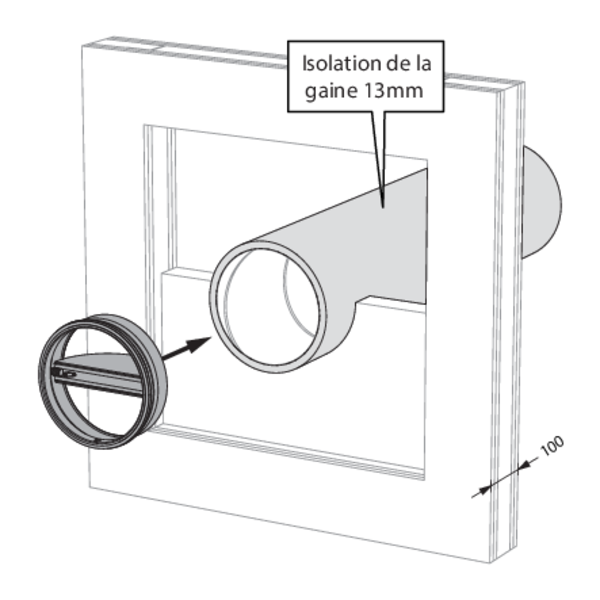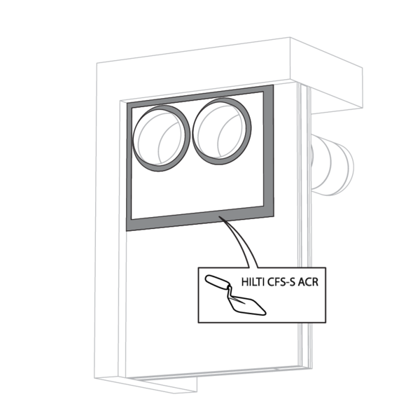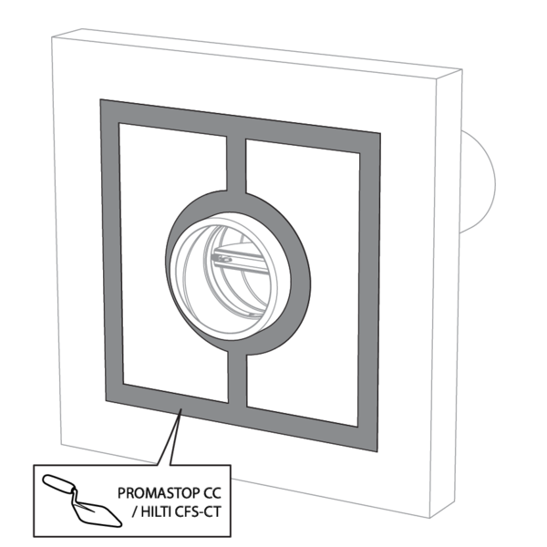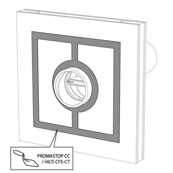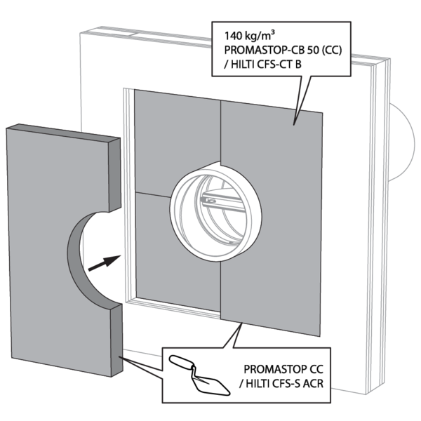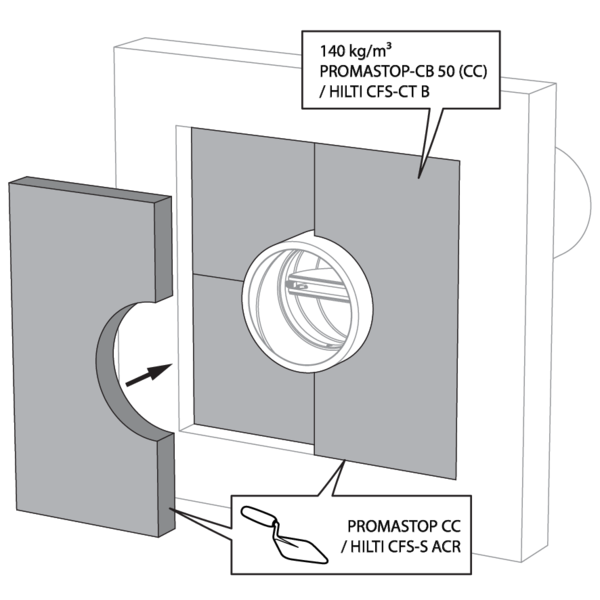 La réservation dans la paroi autour de la gaine isolée est scellée avec 2 panneaux de laine de roche rigides de 50 mm avec couche d'enduit coupe-feu sur une face (type Promastop CB50 / Hilti CFS-CT B).