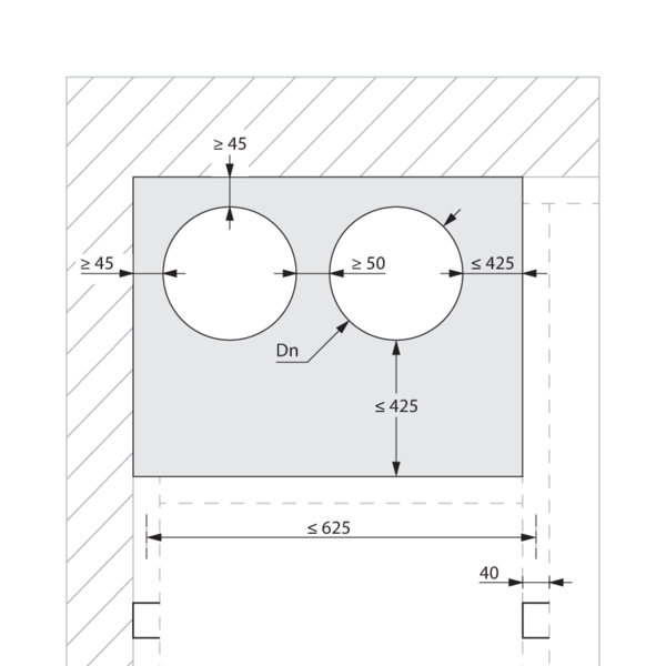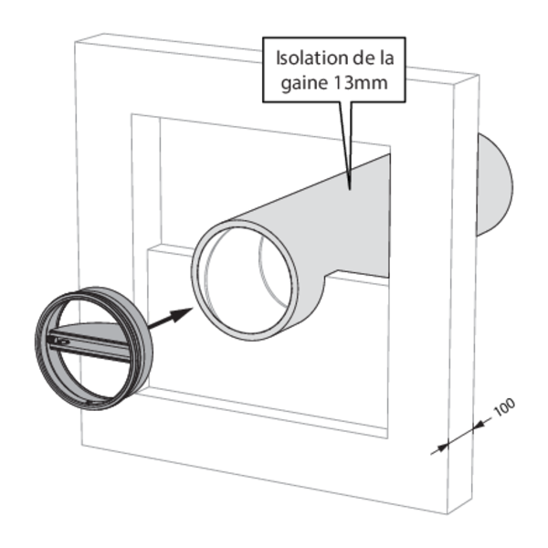 - Ossature métallique et plaques de plâtre Type A (EN 520) ≥ 100 mm | EI 60 (ve i o) S - (300Pa) | Panneaux de laine de roche + enduit ≥ 140 kg/m³ | Type de pose : encastré en conduit traversant, 0-360°. Distances minimales autorisées. | SC+60 Ø 100-200 mm