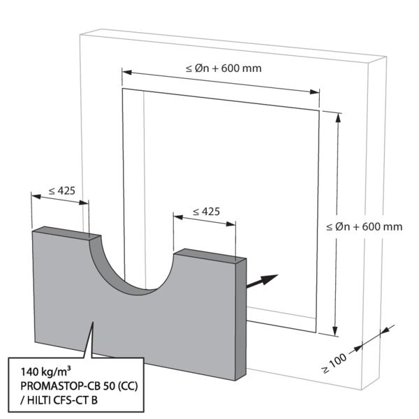 - Béton cellulaire ≥ 100 mm | EI 60 (ve i o) S - (300Pa) | Conduit isolé (ArmaFlex EVO, ArmaFlex Protect – jusqu'à 13 mm) + panneaux de laine de roche + enduit ≥ 140 kg/m³ | Type de pose : encastré en conduit traversant, 0-360° | SC+60 Ø 100-200 mm
