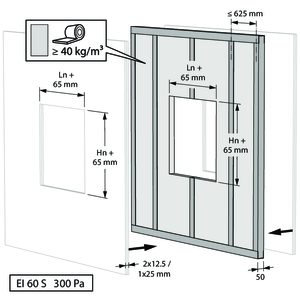• Ossature métallique et plaques de plâtre Type A (EN 520) ≥ 100 mm | EI 60 (ve i o) S - (300 Pa) | Panneaux de laine de roche + enduit ≥ 140 kg/m³ | Type de pose : encastré 0/90/180/270°. Distances minimales autorisées. | 200x100 mm ≤ CU-LT ≤ 800x600 mm