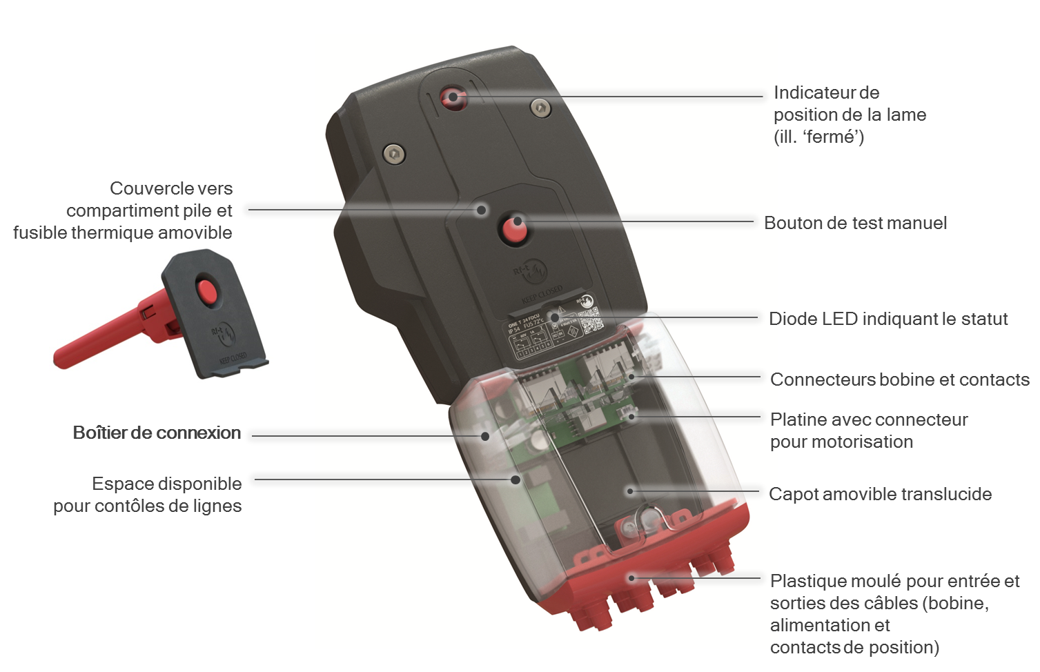 - Second déclencheur thermique intégré dans le boîtier pour détecter un incendie hors gaine.