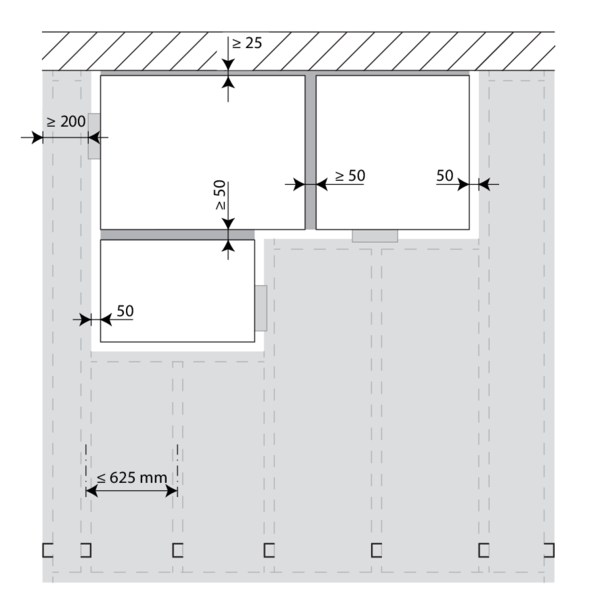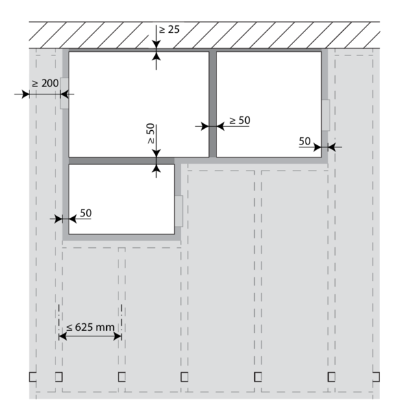 Les clapets peuvent être installés à distance minimale d'une dalle/d'un plafond (≥ 25 mm), d’une paroi ou d’un autre clapet (≥ 50 mm).