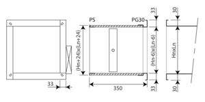 PG30 - Raccordement sur gaines pourvues de brides de 30 mm (soit par système à glissière, soit par boulons). Aussi possible côté conduit au lieu du raccordement PS (à mentionner à la commande). Trous elliptiques de Ø 8,5 x 16 mm.