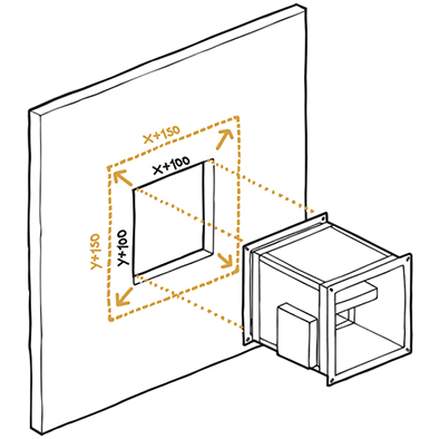 - Ook de afwerking van de sparing moet voldoen aan de voorwaarden in de montagevoorschriften. Vooral bij een lichte wand is deze afwerking van belang: horizontale liggers moeten vaak boven en onder de klep aangebracht worden om de stabiliteit bij brand te garanderen.