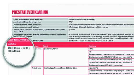 De maximale afmetingen van de brandklep zijn de afmetingen van de grootste geteste klep.