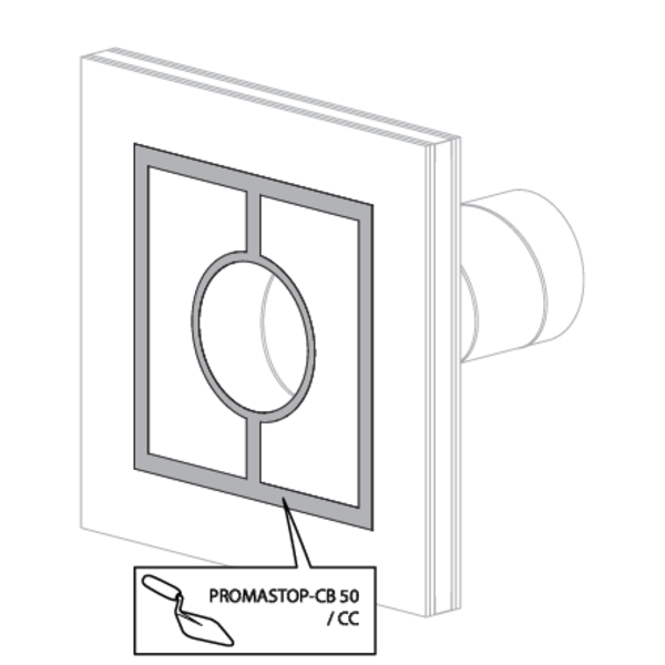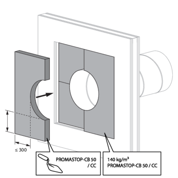 - Cellenbeton ≥ 100 mm | EI 60 (ve i o) S - (300 Pa) | Brandwerende acrylaatkit | Installatiemethode: montage op afstand, 0-360° | Ø 100-630 mm