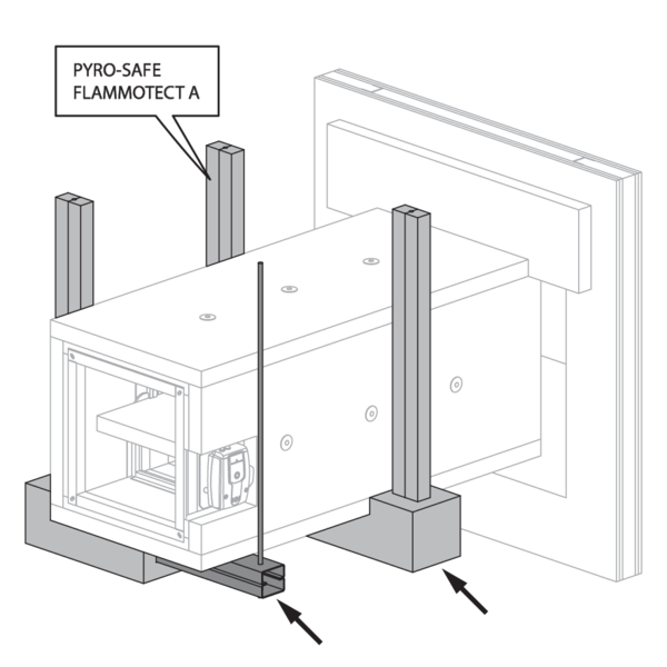 In de wand wordt een opening voorzien van maximaal (Bn+600 mm) x (Hn+600 mm) waardoor het ventilatiekanaal loopt. De opening rond het kanaal in de wand wordt afgedicht met één laag gecoate steenwolplaat type PYRO-SAFE® FLAMMOTECT-A. De randen worden afgedicht met PYRO-SAFE® FLAMMOTECT-A pasta waardoor de platen vast zitten.