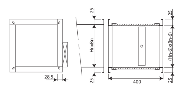 PG25 - Aansluiting op kanalen met flenzen van 20 en 30 mm (met bouten). Ovale gaten Ø 8,5 x 16 mm.