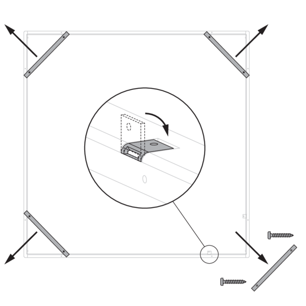 Leg de schroeven, die op een van de dwarslatten zijn bevestigd, opzij. Schroef vervolgens de 4 dwarslatjes van het inbouwkader los en plooi de 8 bevestigingsplaatjes in het kader.
