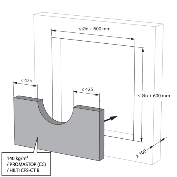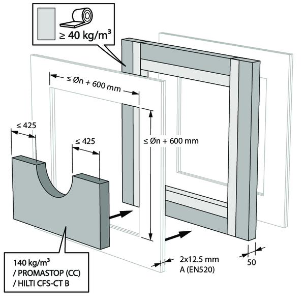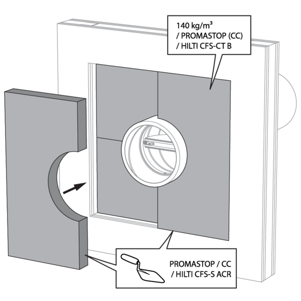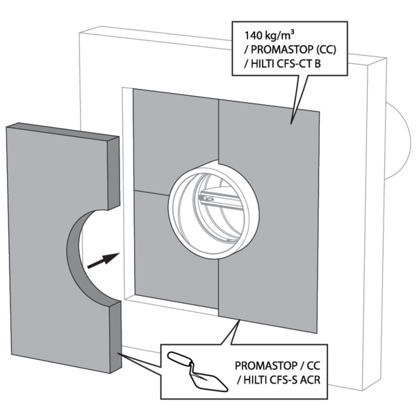 De opening in de wand rond het geïsoleerde kanaal, wordt afgedicht met 2 harde steenwolplaten van 50 mm die eenzijdig voorzien zijn van brandwerende coating (type Promastop CB50 / Hilti CFS-CT B).