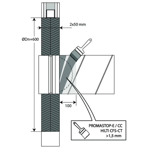 De opening in de wand rond het kanaal waarin de vlinderklep zit, wordt afgedicht met 2 harde steenwolplaten van 50mm die eenzijdig voorzien zijn van 1mm brandwerende coating (type PROMASTOP-CB 50 / PROMASTOP-CB/CC 50 / HILTI CFS-CT B).